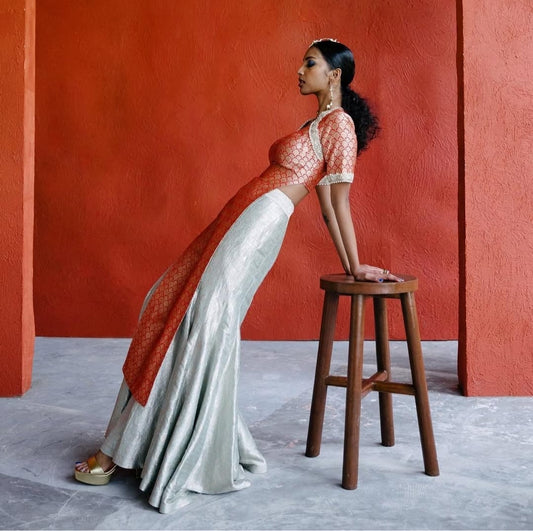 Maroon Zari BANARASI BROCADE Short Kurti with Flared Sharara Set