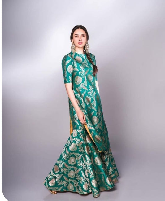 Teal Blue Brocade Sharara Set with Zari Woven Dupatta