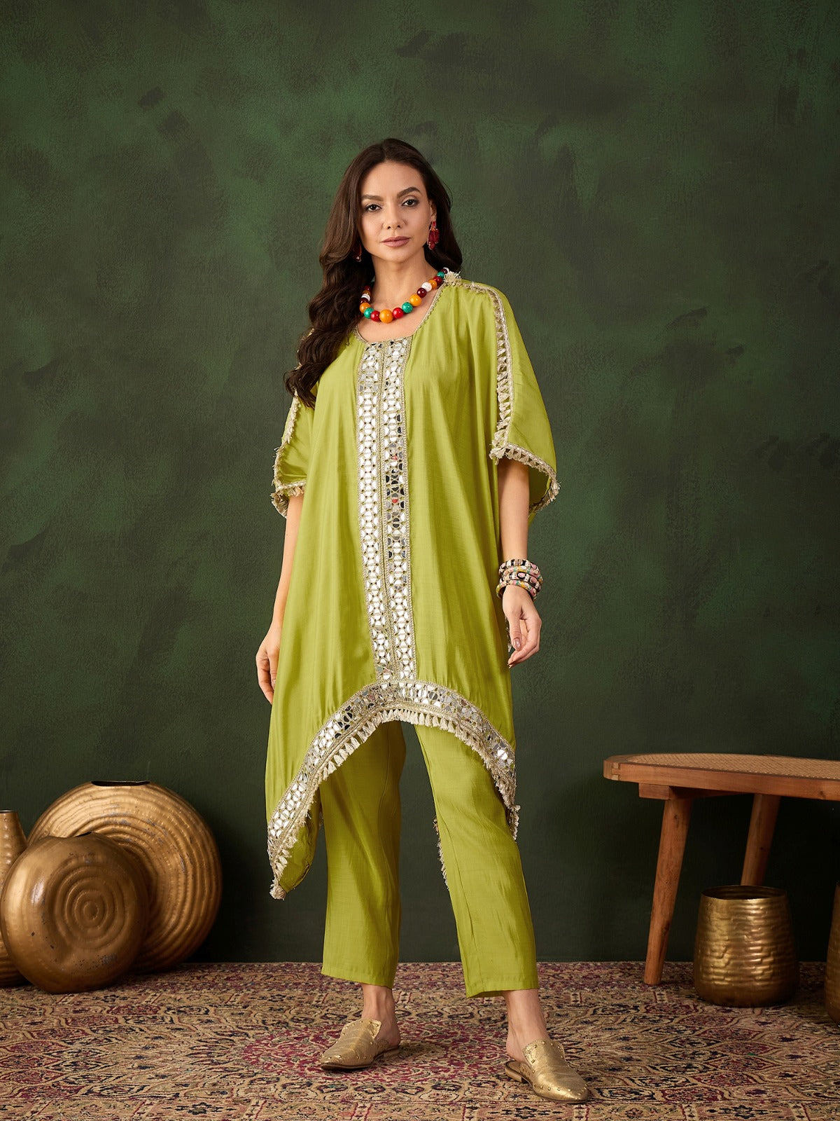 Embrace effortless elegance with this asymmetric muslin kaftan set, featuring detailed mirror work and delicate tassels that add a festive charm. The relaxed silhouette ensures comfort without compromising style, while the straight-fit pants provide practical ease with an elastic waistband and functional pockets. Perfectly balanced, this set combines tradition with modern convenience, ideal for any occasion requiring both grace and comfort.