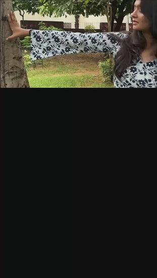 Finding peace under the trees in this gorgeous navy and white floral short kurti. The full sleeves and V-neck make it perfect for a breezy day. Effortlessly paired with classic denim for a chic, casual ethnic look. ✨ #IndianFashion #ShortKurti #EthnicChic #FloralPrint"