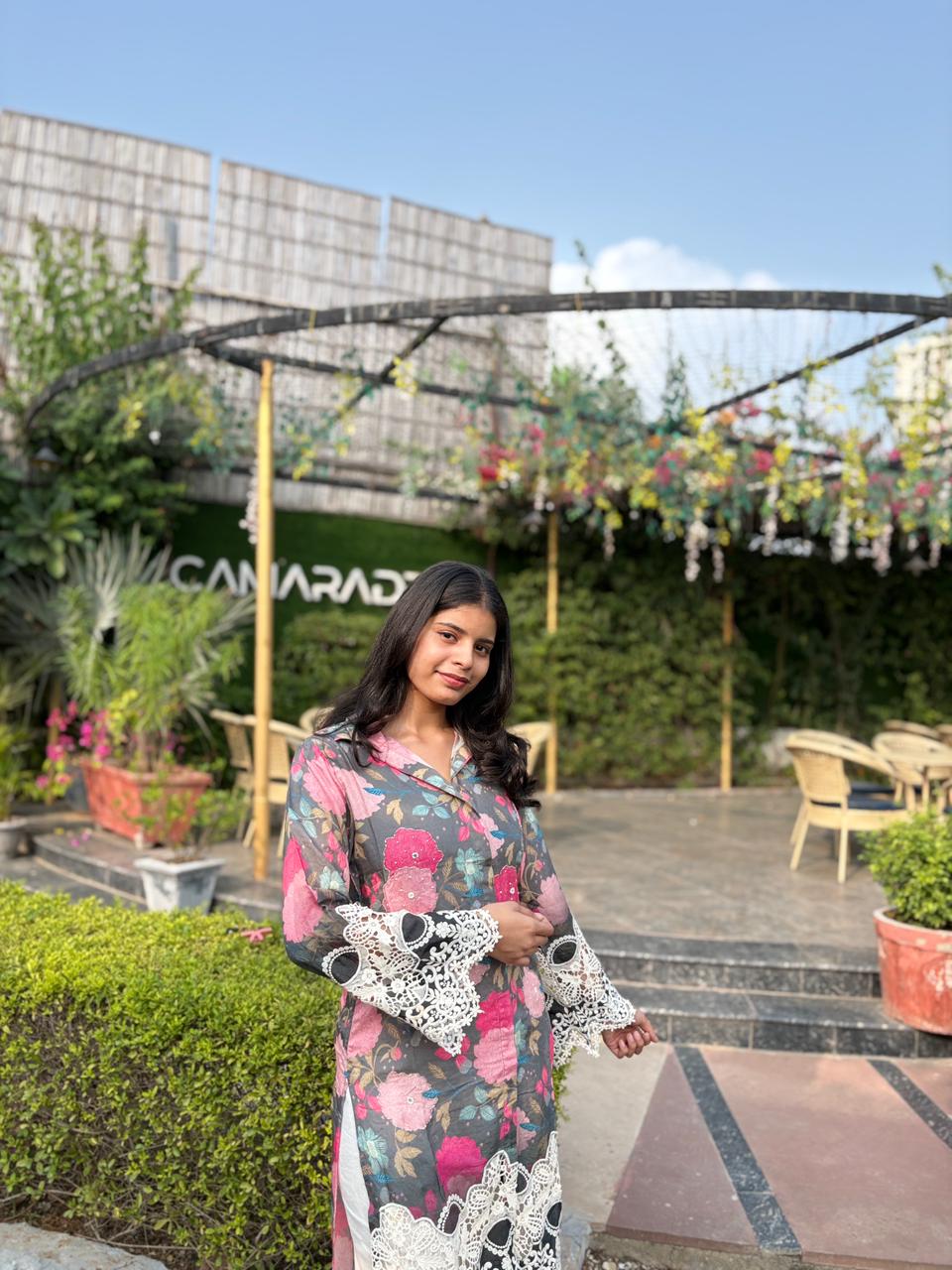 Turn heads in this vibrant straight-fit kurta, adorned with bold abstract floral prints and intricate bead and cutdana embroidery on the front. Accented with elegant crochet lace and a smart shirt collar, it brings a contemporary edge to ethnic style. Paired with a solid dhoti pant, this set blends flair and finesse—perfect for festive soirées or statement daytime looks.