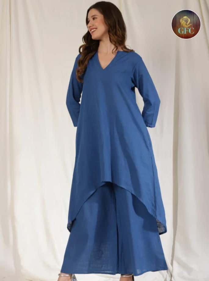 Slub Cotton High-Low Kurta Set With Flared Palazzo